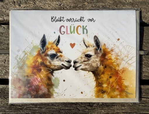 Klappkarte: „Bleibt verrückt vor Glück“ Lama, Alpaka, Watercolor